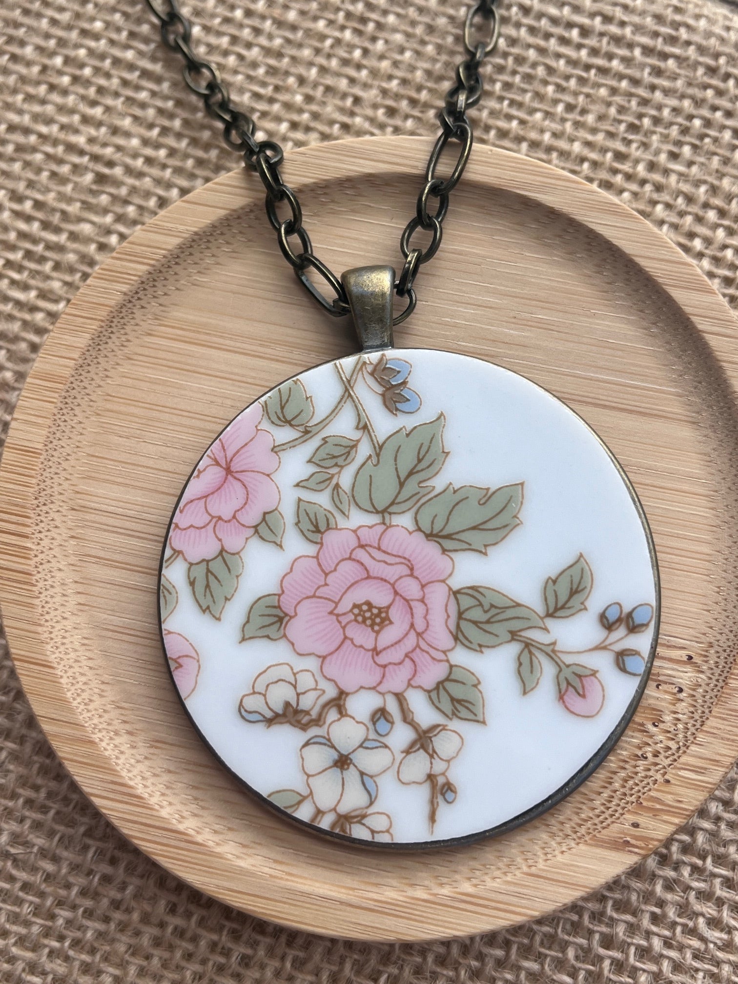 This necklace is romantic and timeless just like the Fairfield Floral Mist china by which it was inspired. The delicate blush-pink blossoms and soft green foliage are beautifully framed in an antique bronze bezel, preserving the gentle charm of vintage porcelain. Hung from a bronze chain, this necklace has a graceful, feminine look the feels both nostalgic and fresh.