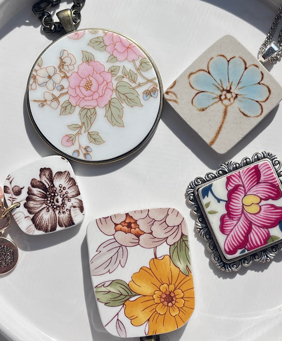 Materials: Repurposed china, metal bezel and chain